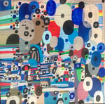 Nina Bovasso Unique painting on canvas using layers of an accumulation of orbs and structuring lines, like a kind of pared down futuristic landscape. Painting is 12x12 inches on a deep canvas using acrylic ink and paint. Created from 2003-2025 .