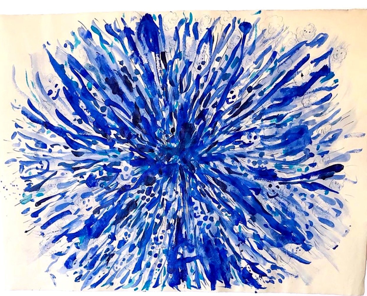 Black on paper 20x25 inches 2024 ink& acrylic on Hahnemühle paper mononchrome blue explosion painting unique signed on back. unframed.