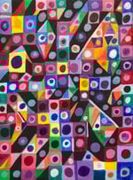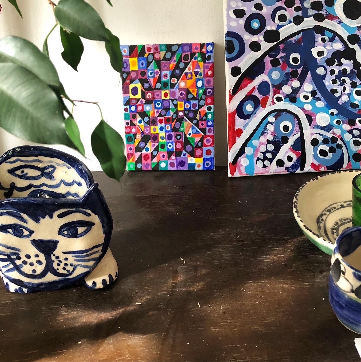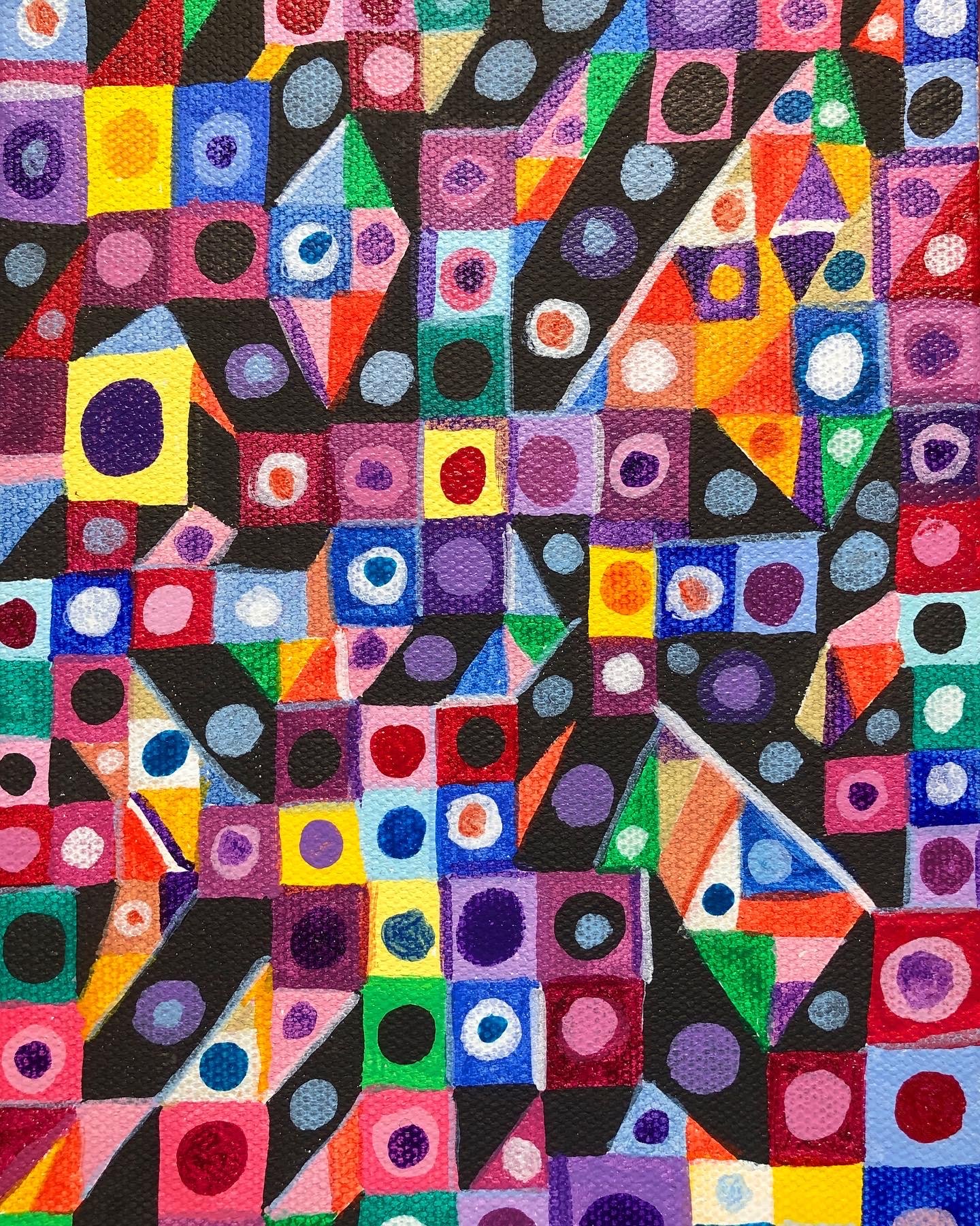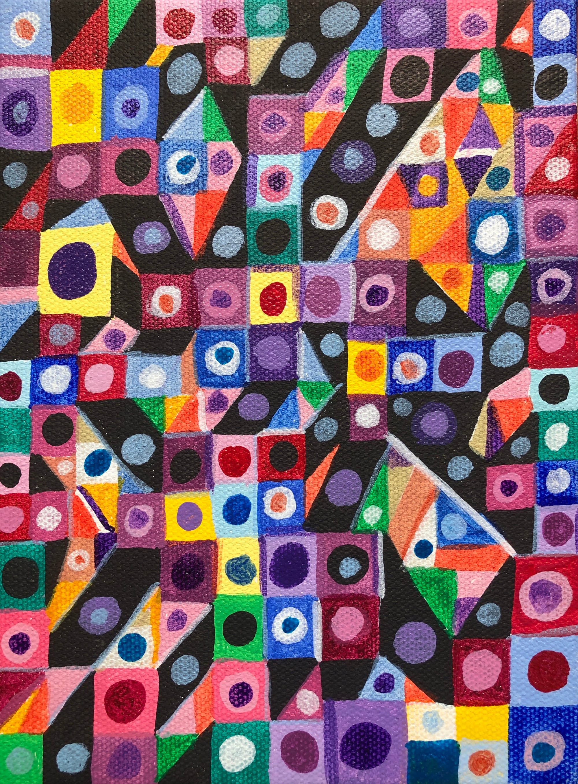 Nina Bovasso, Small grid painting, 2025, Acrylic on canvas painting ,6x8 inches. Unique. Started out as straight grid , but then intersected with other directions. Groovy, right?